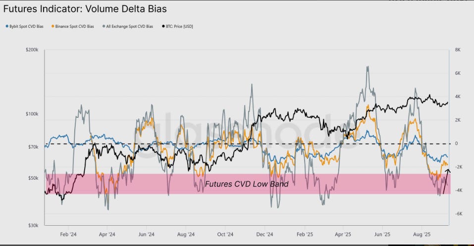 Glassnode says the balance of buying vs selling pressure (aka āvolume delta biasā) has recovered since BTC bounced off $108K.